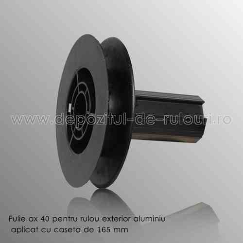 Fulie ax 40 pentru rulouri exterioare aluminiu aplicate 165mm sunt folositenpentru inaltimi de pana la 2,4 metri. Pe aceasta fulie / roata se infasoara snurul sau panglica ruloului si care prin tragerea lor ofera acea rotatie si implicit ridicarea si coborarea campului de lamele.