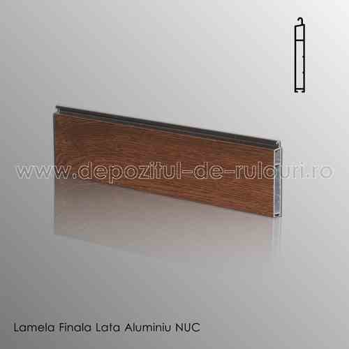 Lamelele finale, terminale late extrudate din aluminiu marca CFT sunt infoliate in nuanta de lemn nuc si sunt utilizate in productia de rulouri exterioare antiefractie cu bolt automat sau cu broasca cu cheie. Lamelele finale late permit montarea de opritori interni lati sau a celor exteriori.