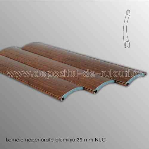 Lamele din aluminiu neperforate de 39 mm vopsite in imitatie de lemn nuc pentru rulouri exterioare aplicate, suprapuse, incastrate sau tencuibile in zidarie au spuma poliuretanica cu densitate mare de culoare albastra. Acestea sunt comercializate in profile de 6 ml si sunt impachetate in folie de plastic cu bule la bax de 360 ml. Lamelele din aluminiu sunt executate de firma Viomal din Grecia iar in Romania exclusivitatea importului acestora o are firma Comfortex Tehno Systems. Pentru a garanta calitatea lamelelor din aluminiu de 39mm nuc este scris din metru in metru firma producatoare si un numar care ajuta in cazul unui defect ascuns de productie.